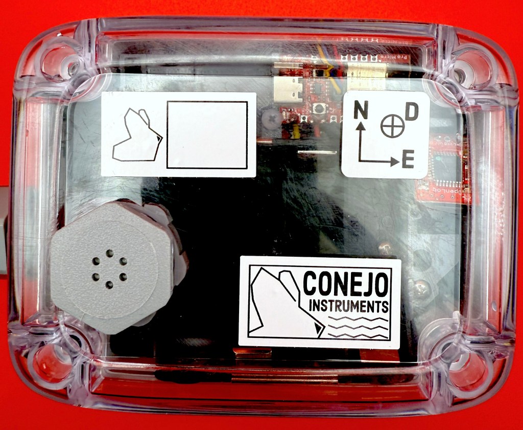 This sensor measures the geomagnetic field along three axes, and also measures temperature. The unit includes built-in data-logging to microSD, power management, and moisture management. 4 AA batteries (not included) will power the instrument for ~2 years. Each unit can withstand temperatures between -40 to 100 oC. We recommend lithium AA batteries for cold-weather environments. The instrument is 13 x 8 x 5 cm.